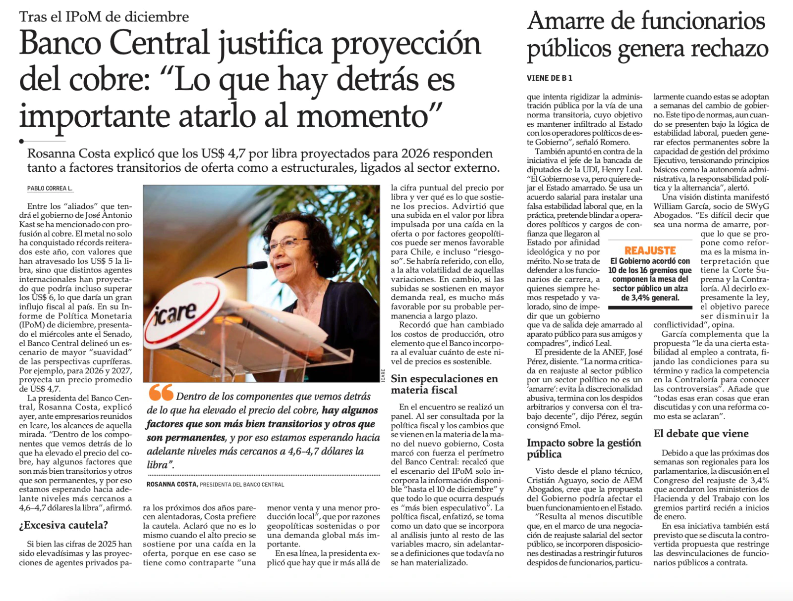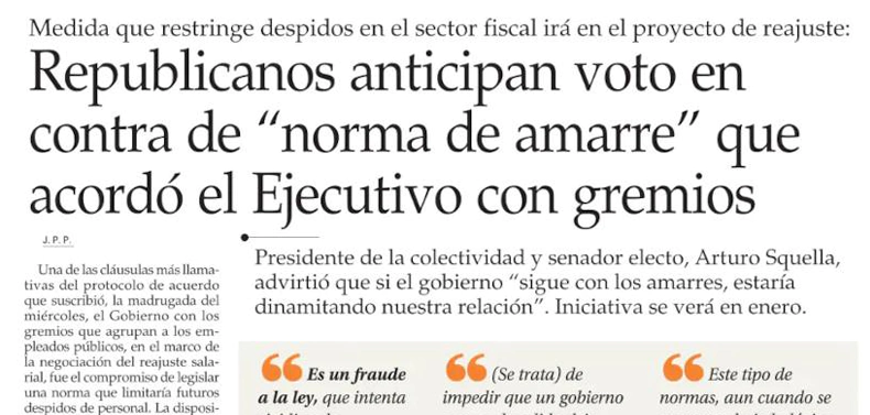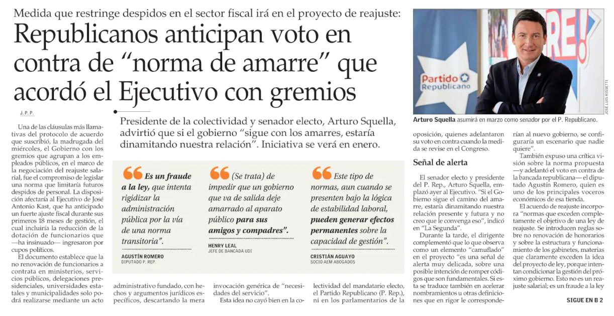 Nuestro socio de AEM Abogados, Cristián Aguayo entregó su opinión a El Mercurio respecto del debate que se ha abierto por el reajuste del sector público. Más allá del porcentaje acordado, el foco jurídico está en una inédita norma incorporada, la cual establece que la no renovación de contratas —o su renovación en condiciones distintas— en organismos públicos, sólo podrá efectuarse mediante un «acto administrativo fundado»